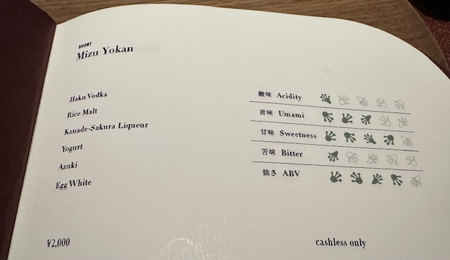 イノヴェーティヴ寄りのフレンチが手がけるバーとあって、独創性の光るオリジナルカクテル・モクテルが揃っている。たとえばMizu Yokanというカクテルには、小豆とヨーグルトというどう考えても合わない両者が同居している。