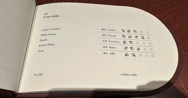 続いて選択したカクテルは「うめちこ」。麦焼酎いいちこに白胡麻を漬け、梅と煎り酒でひたすら旨味を足す。焼酎のドライなコンテクストに梅昆布茶のような味わい。後味には白胡麻の香ばしさが残る。