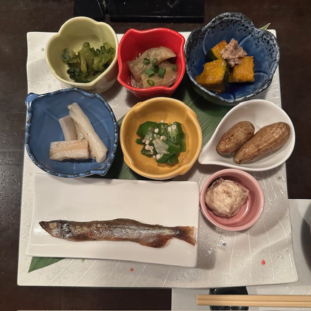 この店では豪華なお通しが出てくるのがお約束である。1,580円と高額ではあるが、下手な居酒屋であれば300円くらい取られる小鉢が8品、さらにお吸い物もついてくる。内容も茄子のお浸しやオクラ、南瓜の煮物等素朴なものから、茹で落花生や柳葉魚という乙な品まで多彩。ゴーヤの苦味がガツンとくれば、繊細なペペロンチーノ味の蓮根で口直し。手の込んだ前菜盛り合わせであり、これだけで満足してしまう人もいることだろう。