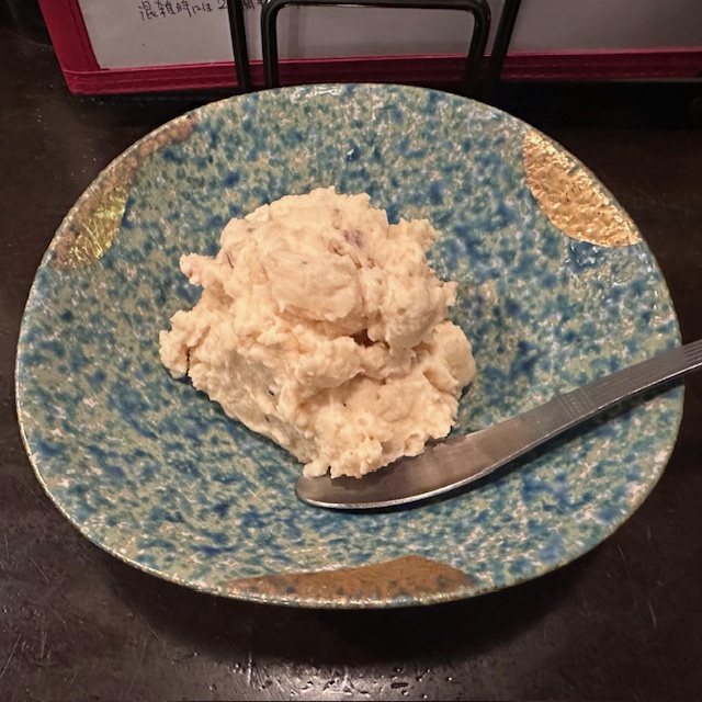 自由意志による1品目は名物の酒盗ポテトサラダ。酒盗とは銘打っているが、印象に残るのはベーコンらしき大きめに切られた具材。腹を満たしつつ酒を進めたいカケルにはうってつけの摘みであった。