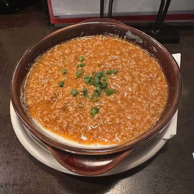 〆には担々肉豆腐を注文した。自家製豆腐を流し込み肉味噌を掛ける。担々は肉の粒立ちが良く、そして唐辛子が実直に辛い。花椒は不使用と思われる。それでも豆腐のどろっとした円やかさが主張をしてメリハリが効いている。