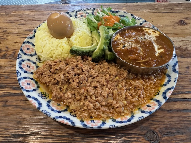 そして追加トッピングの酢醤油たまごは、酢の酸味と卵のコクが良いバランス。カレーの合間に摘む副菜として適任である。さらに中央に盛られたゴーヤはしっかり苦くて、一皿に多様な味が詰まっている。