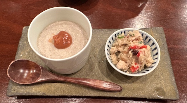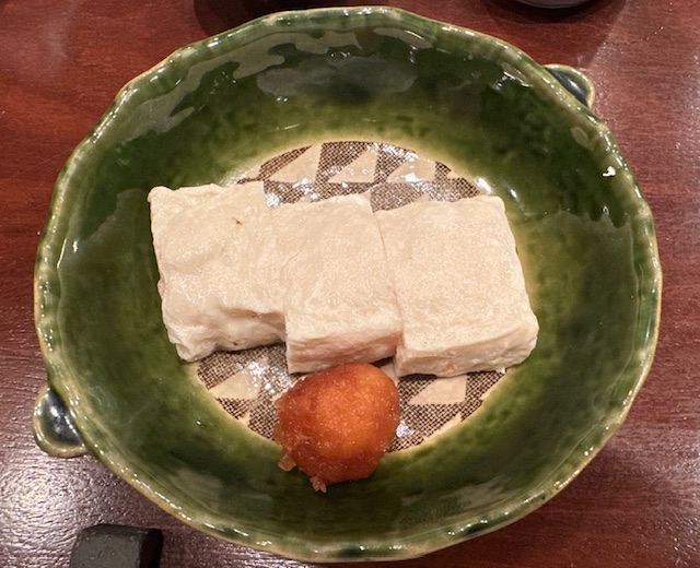 食事はコースで提供され、その他追加で一品料理を頼むことができる。まずは牛蒡の茶碗蒸しと卯の花から。卯の花は特段美味しいと感じるような料理にはならないものだが、牛蒡の茶碗蒸しは素材の味が感じられて流石一流の業である。
