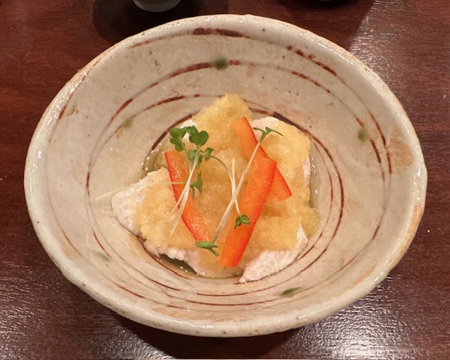 水晶鶏に林檎のみぞれ掛け。水晶という名の通りさっぱりとした味の鶏肉である。それでもしっとり柔らかく仕立ててあるから食べやすいし旨みも感じる。林檎の繊維質の味が鶏肉に馴染んで面白い。