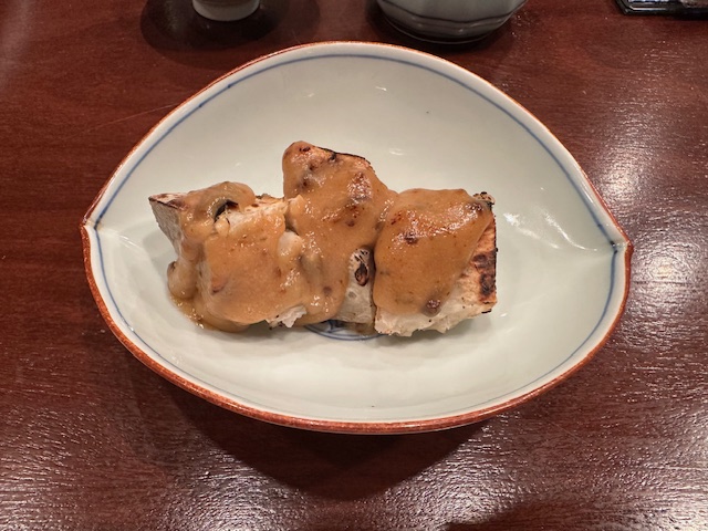 この世で最も美味しい食べ物のひとつ・海老芋。ここでは山椒味噌を塗って焼いている。とろっと溶ける海老芋に味噌の濃さと山椒の香り。何とも乙な組み合わせである。