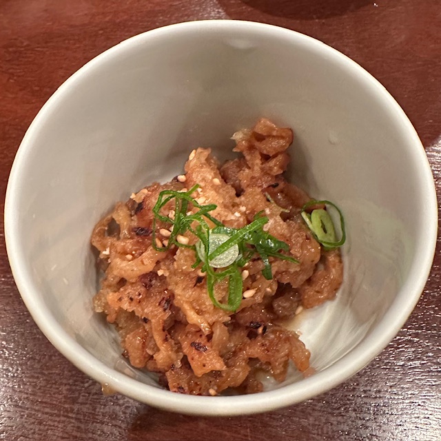 追加で鶏皮おろしポン酢を注文した。鶏皮は一転ばっちり焼かれていてかなり萎縮している。香ばしい脂が滲み出て辛味大根おろしと融合するが、少しポン酢が強く感じるため、皮の柔らかさをもう少し残しても良いのではないかと思う。