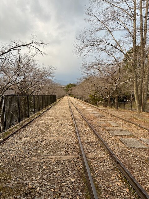 蹴上インクラインに到着。ここはかつて、琵琶湖の水を京都に運ぶための水路「琵琶湖疎水」の一部であった。36mの高低差はそのままだと船が通行できないためインクラインという傾斜鉄道を敷いていた。全長582m、建設当時は世界最長の傾斜鉄道であった。舟運の衰退により戦後に使用停止されたが、レールが復元され観光名所として人気となっている。2025年8月には琵琶湖疏水施設の構成資産として国宝に認定された。