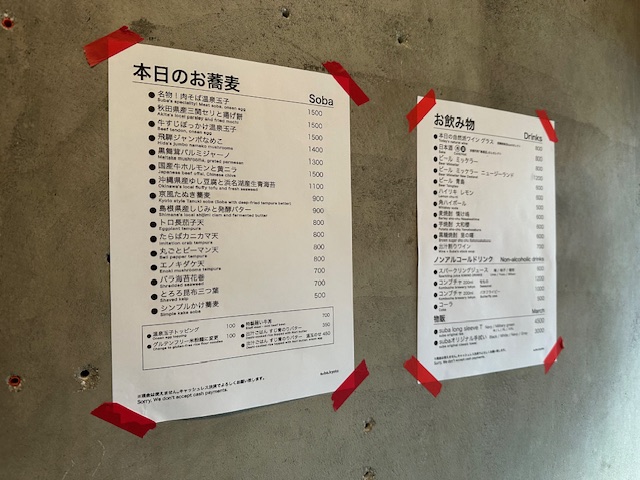 大徳寺から40分強かけて蕎麦屋に到着。伝統渦巻く京都において革新的な蕎麦を提供する店であり常時行列ができている。あの寺門ジモンも通っているという店であり、元も子もないことを言うと東京の渋谷にも店舗がある。立ち食いではあるが、席は大きなテーブル2つのみであり、一度に入れる人数は頑張って16人。回転は意外と良くなく、行列の長さの割には待つと思った方が良い。慣用句帳を読んだり世界地図を眺めたりしながら1時間弱待つ。