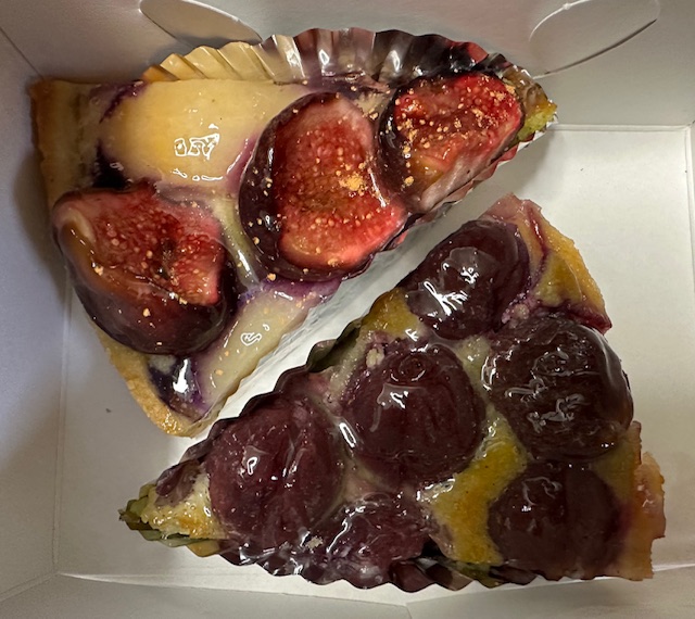 デザートとしてタルトを食べる。ケーキ屋の生菓子のタルトとは違って生地の密度を高く、かつしっとりと仕上げている。巨峰タルトは皮を剥いで果実の原型を残す目新しいスタイル。生地が果汁を確と受け止める。南仏産無花果のタルトは、先ず同居する桃の果実味が大層フローラルでありタルトとも一体化。主役の無花果は国産のものと違って兎に角肉厚であり食べ応えがある。どちらも1350円、1400円とかする高級品であるが、果実の新鮮さを保ちつつ味を凝縮する技術が素晴らしく、それに見合った貫禄と華を持つタルトであった。