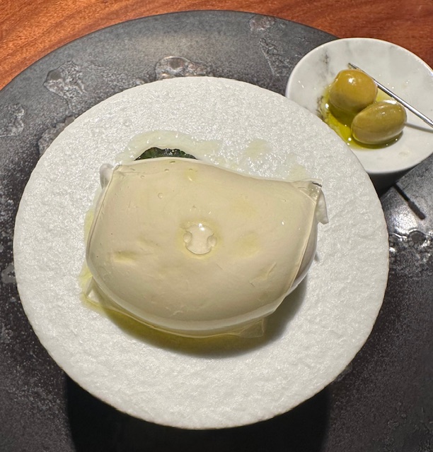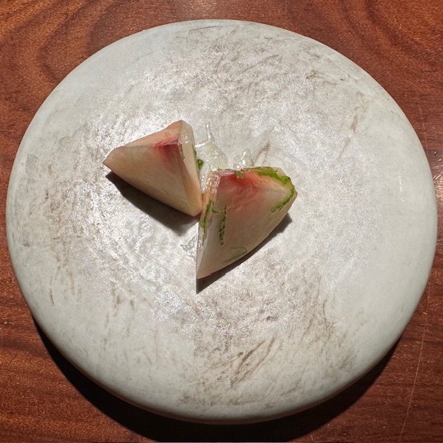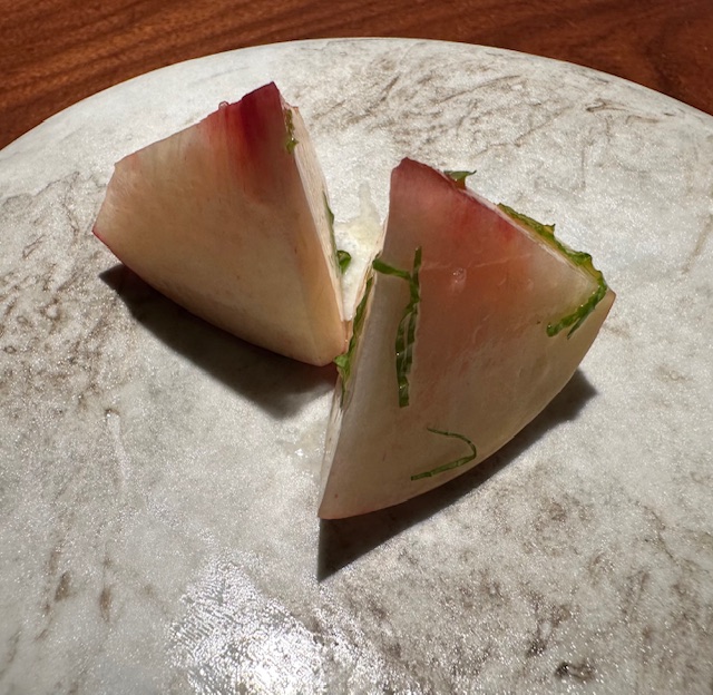 口直しに桃。ブランド名はとろももだが、林檎のように硬いタイプである。オイルの塩気がセクシーな甘みを引き立てていて、イタリアン料理人の矜恃を感じる。