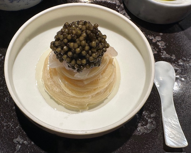 中国浙江省キャビアのタリオリーニ。キャビアは塩気を控えめにし、魚卵のコクに振り切った印象。冷製パスタとはいえ麺が締まりすぎていないからキャビアとよく融合して美味しい。さらにこの月は、薪で燻製をかけた富山の白海老も合わせて。燻製により生海老特有の香りが演出される。