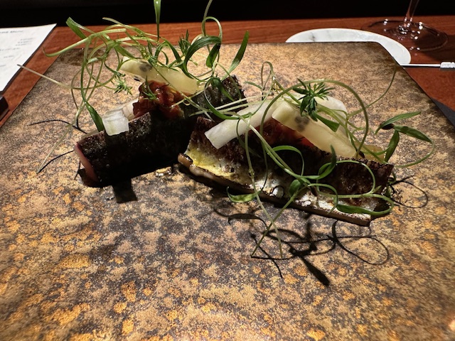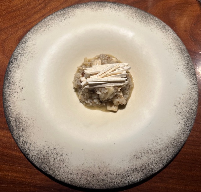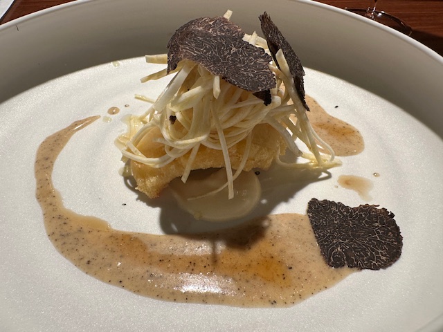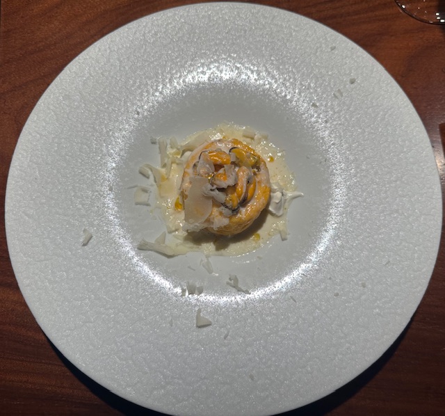 続いては秋刀魚のカルパッチョにとろ茄子、そしてウイキョウのサラダ。赤いソースはアーモンドやオレンジなどを混ぜ合わせたものである。秋刀魚の身、茄子の文字通りのとろ感、ウイキョウの青さ、ソースのナッツ感が渾然一体となって咀嚼される。それでも食後感は正に秋刀魚の個性であり、西洋の一体感と日本の素材主義を両立させている。