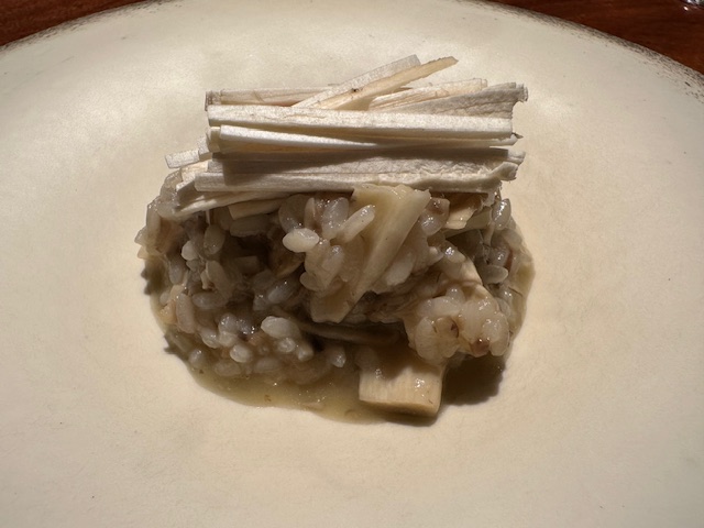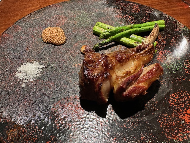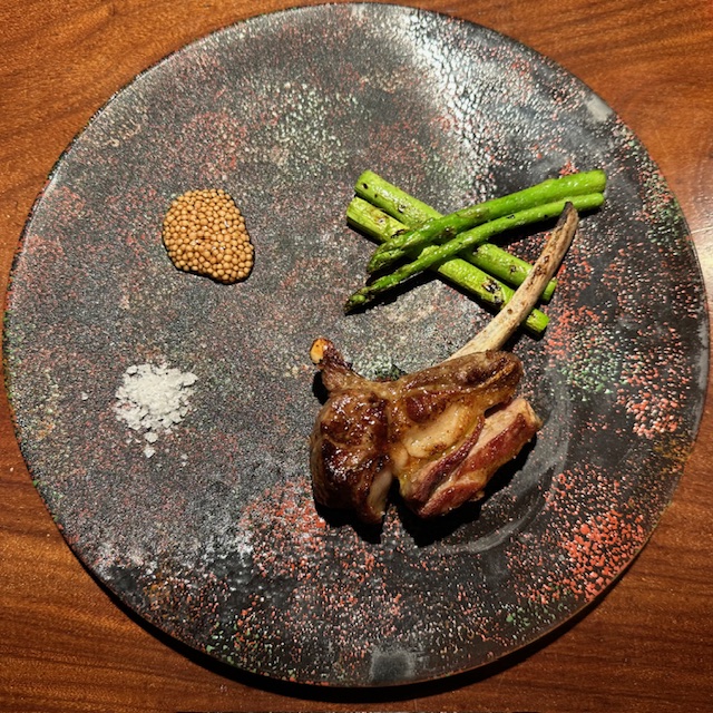 タスマニアの仔羊。薪焼きによりラム特有の香りを残しつつクセを抑え、先端の脂身が少ない箇所は水分が均等に残りクリアな肉質をクリアにしている。持ち手寄りの肉は脂がたっぷりでラムの個性が強め。最後骨周りはゴム手袋を装着して手づかみで。少し塩を振って食いかかると脂の旨みが出て良い。アスパラも、細くはあるが甘みは申し分無しである。