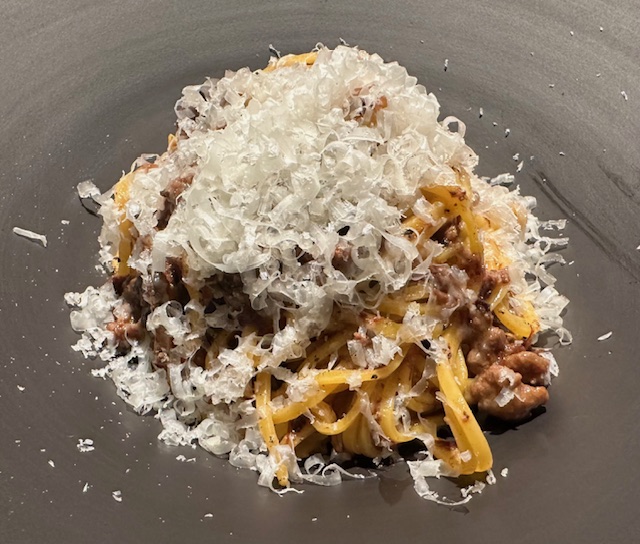 ボロネーゼは量の指定ができる。キャビアのタリオリーニを基準に決めると良いだろう。タテルは最初100gと宣言してシェフをたじろがせてしまい、申し訳無さから80gに減量した。