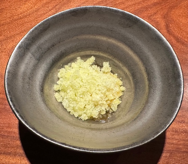 デザート1品目は青蜜柑のグラニテ。下に果実が入っているとても酸っぱく、ジュレ・グラニテおよびハーブクリームで甘みを補う。蜜柑のアイデンティティを感じ、口の中で舌鼓を鳴らしながら味を斉える。