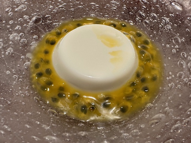 木次パスチャライズ牛乳のプリンに、兵庫県産パッションフルーツ。底のアールグレイキャラメルソースと合わさるとミルクの力が発揮され、パッションフルーツの強い酸味も丸くなる。