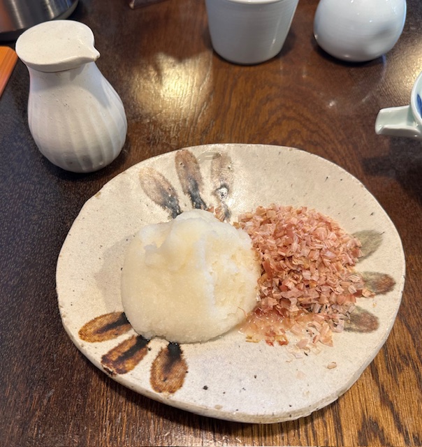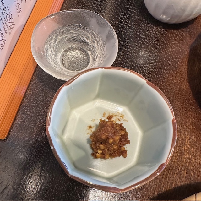 25分程して次の摘み・あらばしりが登場した。ネーミングからすると日本酒を思い浮かべる(ため店員からも注意喚起される)が、こちらはおろしたての地大根である。これがかなり辛い。口の中が麻痺してしまう辛さである。鰹節や醤油を混ぜ混ぜして食べても辛い。