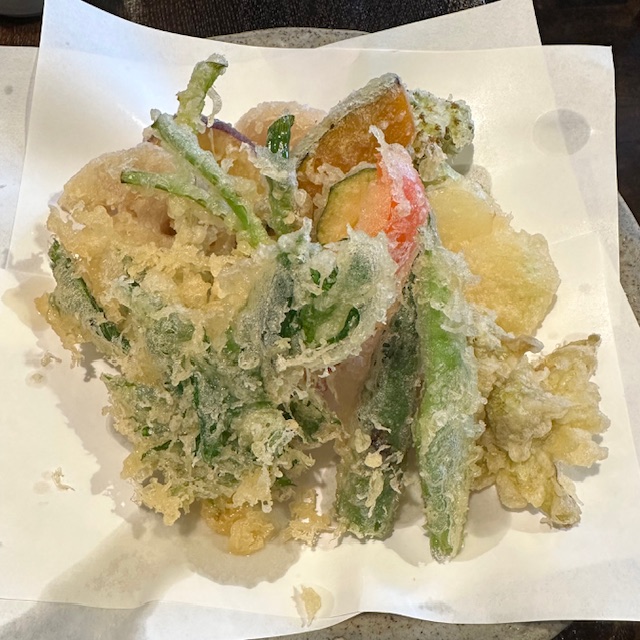 間も無くして野菜天ぷら盛り合わせもやってきた。全体的に軽く香ばしく揚がっており、種類も盛り沢山。1種類につき2つあるものも多いのでシェアにも向いている。蕗の薹などの苦い山菜も脂と交われば旨味となる。さつまいもは銀座の近藤にも匹敵する甘みの引き出し方であった。