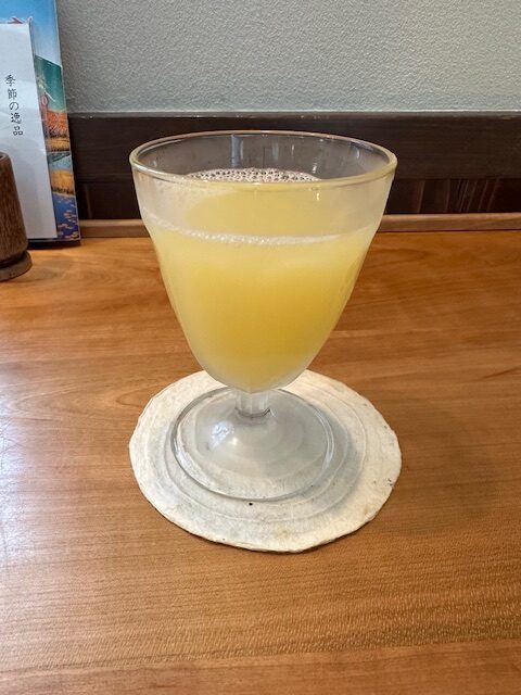 最終的に順番が来て席に案内される。飲み物のメニューを見ると、やっぱり戸隠のクラフト蕎麦ビールに惹かれてしまうが、ここは万全を期して須坂産りんご果汁を注文する。みそ包み揚げなどの一品料理にも興味が湧くが、ここも腹を膨らませすぎないよう蕎麦で我慢する。売り切れを覚悟していた十割蕎麦が1人前だけ残っていたためタテルが注文した。
