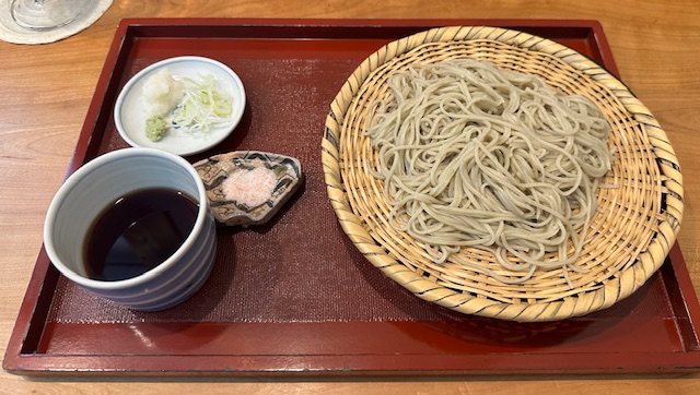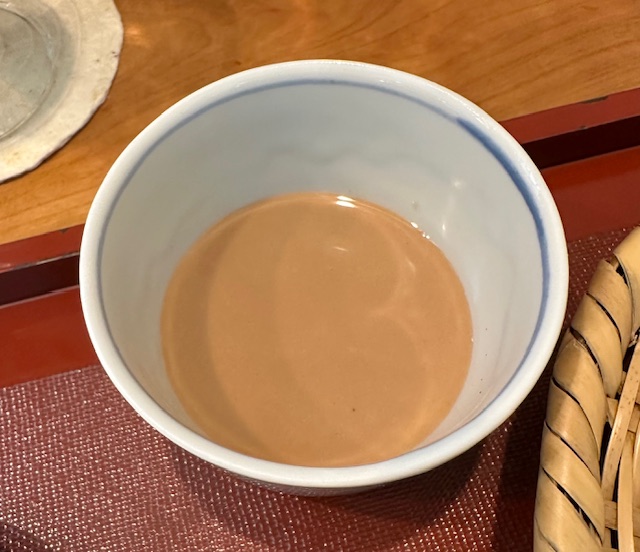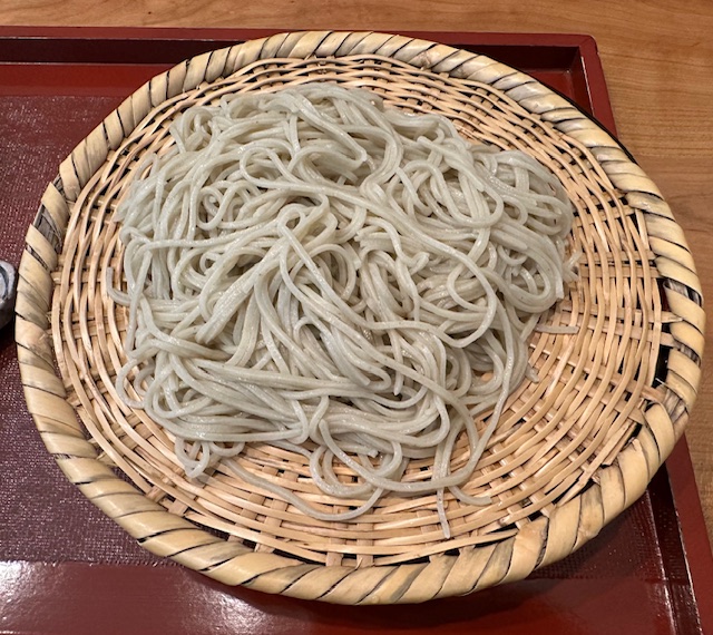 そこで胡桃つゆを単品で追加する。貴重な十割蕎麦を胡桃に浸すのは申し訳ない気もするが、信濃の地の物を少しでも多く堪能しておきたい、という気持ちもまた確かである。川上庵では円やかな仕上がりになっていたが、こちらは返しが効いているからかスモーキーな仕上がりとなっている。