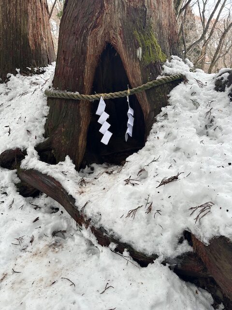 注連縄の括られた傍の木に祈りを捧げ、2人は随神門から200mの地点にて引き返すこととした。奥社へ参拝できなかった無念を引き摺る足取りは迚も重い。