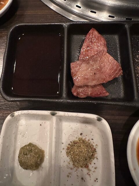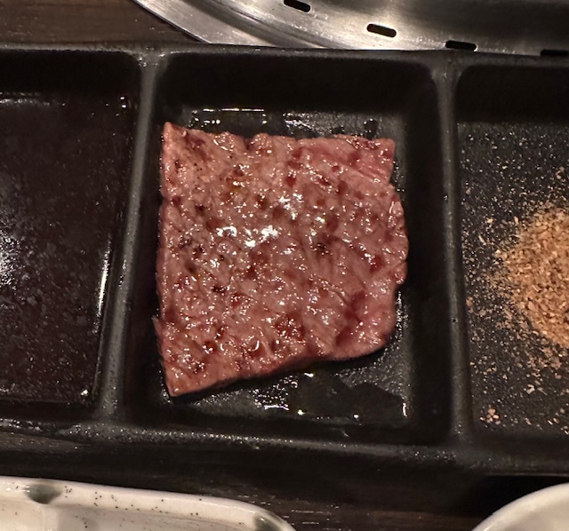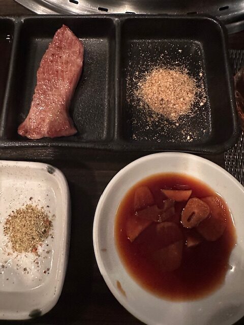 肉は全て店員が焼いてくれる。焼く前にプレゼンテーションされる肉は見事な赤白のバランスで美しい。誰しもがテレビ等で観て食べたいと憧れる類の綺麗な肉である。焼き上がったら店員が一口大にカットし、お勧めの食べ方(調味料)を案内してくれる。